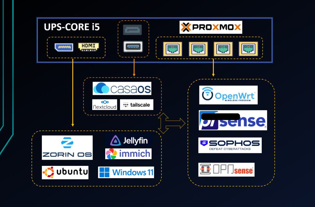 對比起UPS-N100/N150系列,UPS-CORE 硬件性能和拓展性更佳、Proxmox的All-in-One構建更加完善性。功耗方面UPS-CORE的大約比UPS-N150多5-10W,因此電源也從50W 提升至 60W。另外,UPS-CORE 的設計有唔少特別的地方: